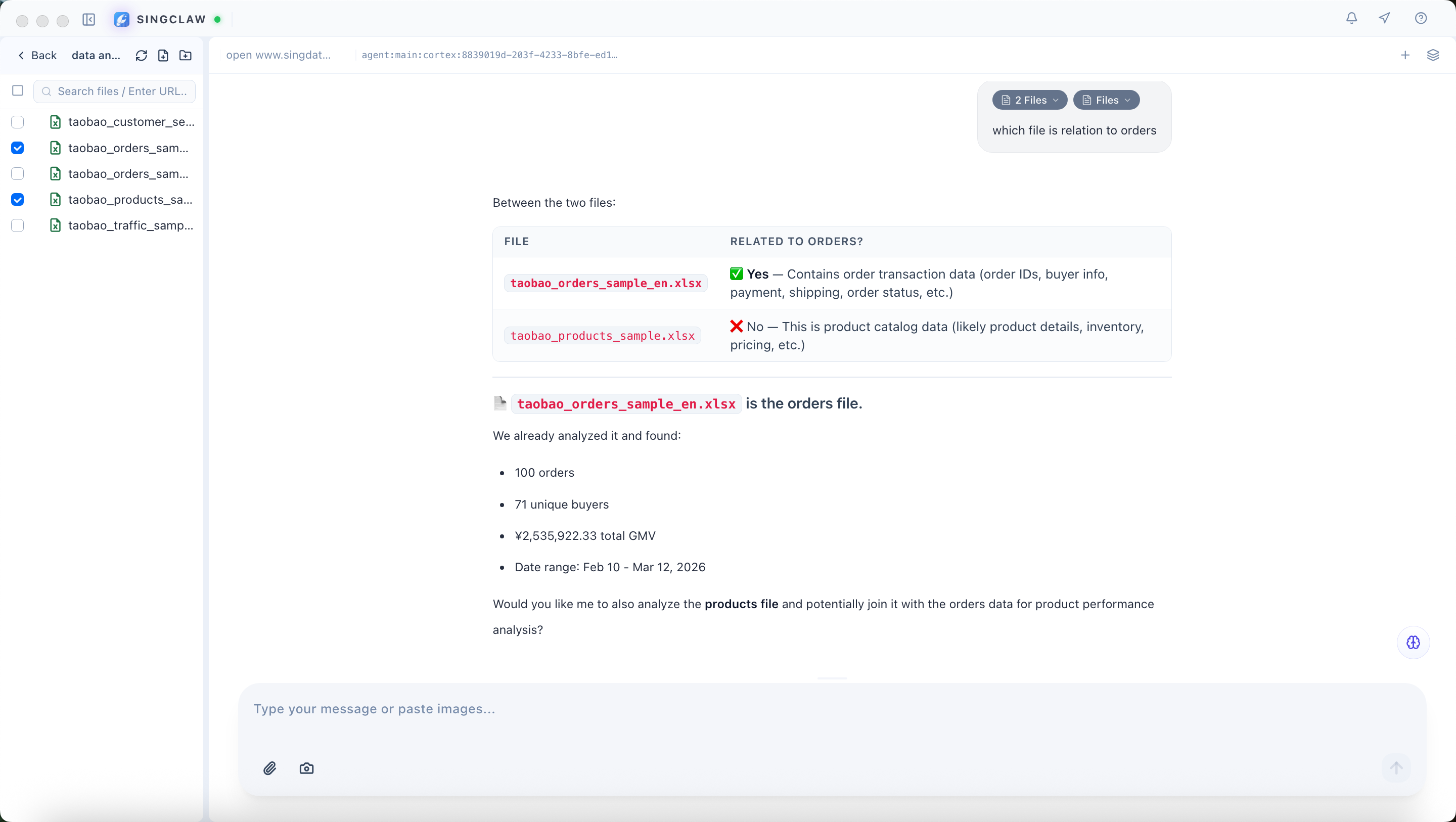 Batch File Ingestion — Users can upload multiple related files at once (e.g., Taobao order-related files). All files are managed in SingClaw's workspace without manual sorting or categorization.
